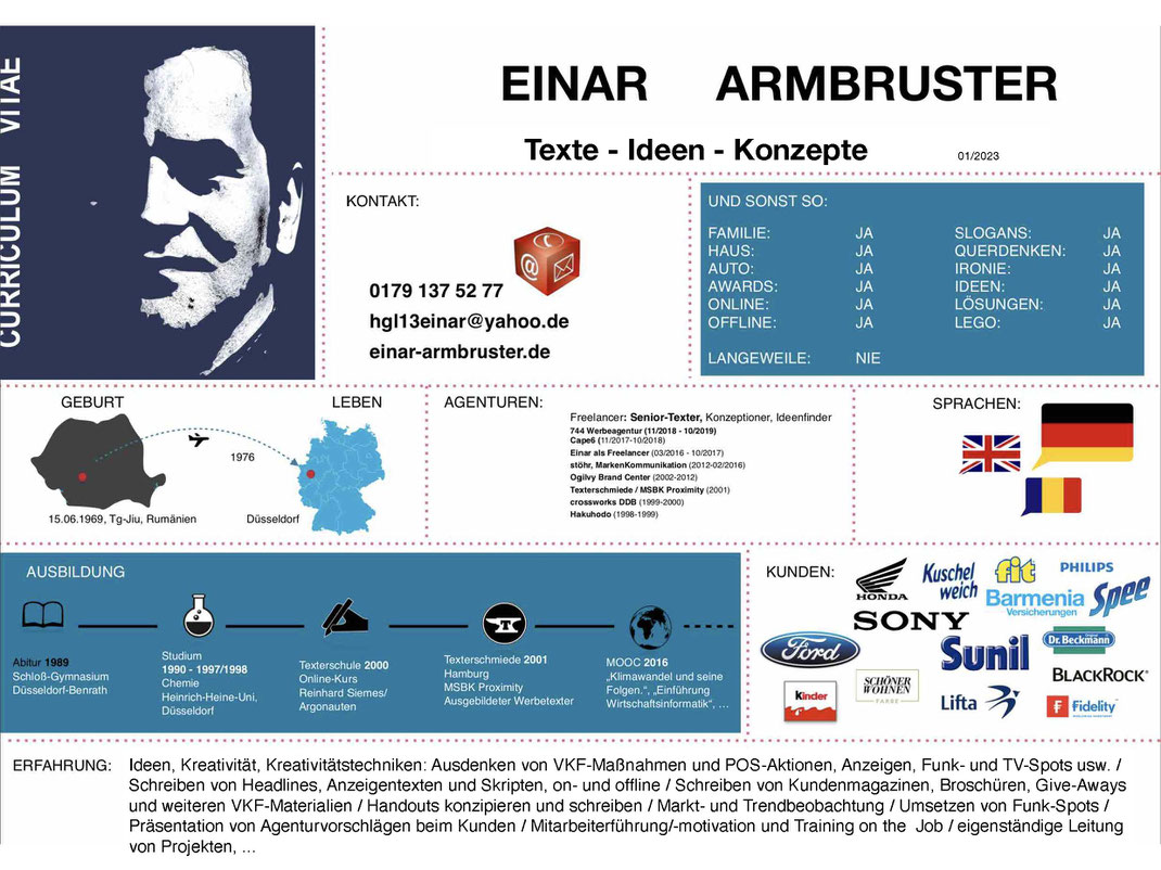 Das ist das Curriculum Vitae, das Agenturen und Kunden mit meiner Mappe bekommen. Wer Interesse hat, schicke ich gerne die komplette Mappe zu.